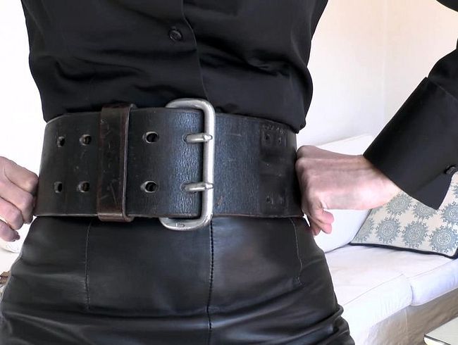 Heute trage ich eine schwarze Bluse und einen engen Lederrock. Dazu habe ich einen meiner breiten Ledergürtel kombiniert. Heute kam das Paket an, ein Gürtel Geschenk von Feuerwehrmann Rudi. Er schenkt mir seinen breiten Ledergürtel. Ich vergleiche meinen breiten Gürtel mit dem Gürtel von Feuerwehrmann Rudi. Ich probiere den neuen Gürtel an und stelle fest, dass der neue Gürtel sehr breit und mächtig ist. Dickes Leder, sehr stabil verarbeitet! Und es fehlen noch Löcher damit ich den Gürtel eng um meine Taille tragen kann. Ich trage den Gürtel auf meinen Hüften und schiebe ihn dann hoch. So wird es aussehen, wenn er dann passt. Gefällt Dir mein neuer Gürtel? #Ledergürtel