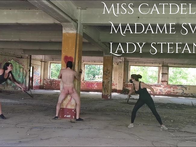Gemeinsam haben wir, Madame Svea, Miss Catdeluxe und Lady Stefanie, bleibenden Eindruck in Leipzig und bei seinen Devotlingen, Sklaven und Fetischisten hinterlassen. Allerlei verschiedene Arten von Locations wie BDSM Studio, Lost Place, Garten, Park, Cam etc. wurden zu unserem Vergnügen sowie unserer Belustigung genutzt! Es gibt doch nichts Schöneres als aktiv dabei mitzuwirken und zusehen zu können wie sich ein Sklavenarsch verfärbt und sich immer mehr Striemen da abzeichnen, wo vorher noch zischend die Bullwhip gelandet ist. Madame Svea, Lady Stefanie und Miss Catdeluxe haben mal wieder ordentlich die Peitschen schwingen lassen. Reihum wurde der Sklavenhintern von uns Ladies ausgepeitscht. Immer und immer wieder hallen die Schläge durch den Raum, sowie das anschließende Stöhnen von unserem angebundenen Subjekt. Auch sein Tänzeln, Singen und Arschwackeln hat ihm nicht weiter geholfen. Gnadenlos zischen die Peitschen beinahe endlos durch die Luft und landen knallend auf seinem Hintern, bis er letztlich mit seinem Codewort „Sudzuk“ aufgegeben hat.