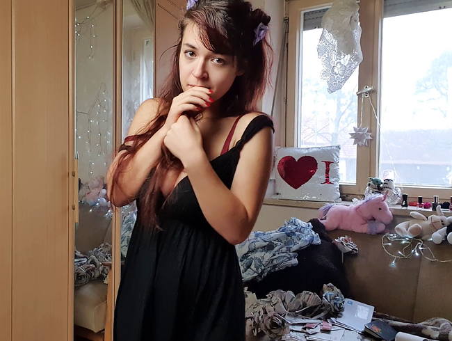 Ich zittere immer noch ein bisschen, das ist mir total peinlich. Ich bin gerade ziemlich in Erklärungsnot geraten. Wie fang ich am besten an. Das ist alles so neu für… Ich trau mich noch nicht viel, aber ich wollte was zeigen, das für mich wirklich super privat und irgendwie auch sehr intim ist. Bitte nicht lachen… Ich habe ein Video gemacht, bei dem ich tanze… Du bist hier bestimmt ganz andere Sachen gewöhnt, aber für mich ist das was ganz Besonderes. Ich durfte das früher nicht, schon gar nicht in diesem Kleid. hat mir eine Freundin aus der Schule geschenkt, meine einzige Freundin von „außerhalb“. Ich habe noch nie vor Leuten getanzt, immer nur heimlich für mich alleine. Als meine Träger gerade runtergerutscht sind, klopft es plötzlich! Ich wohne hier ja bei der Familie eines Freundes und seine Mutter kommt immer direkt rein. Zurecht fragte sie mich, warum ich im Winter so ein Kleid anhabe und was ich überhaupt mache? Ich habe was von „anprobieren“ und „neues Kleid“ gestammelt und hoffe sie hat nichts bemerkt. Ich hab mich so erschrocken!